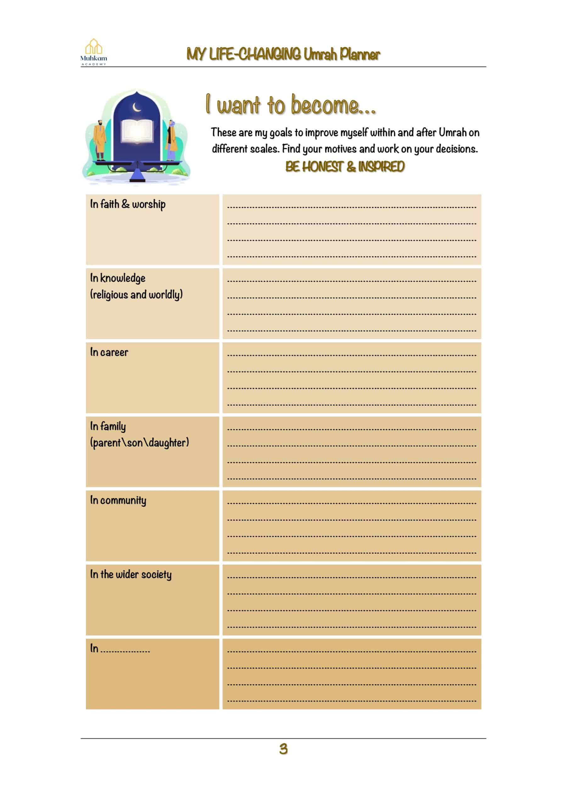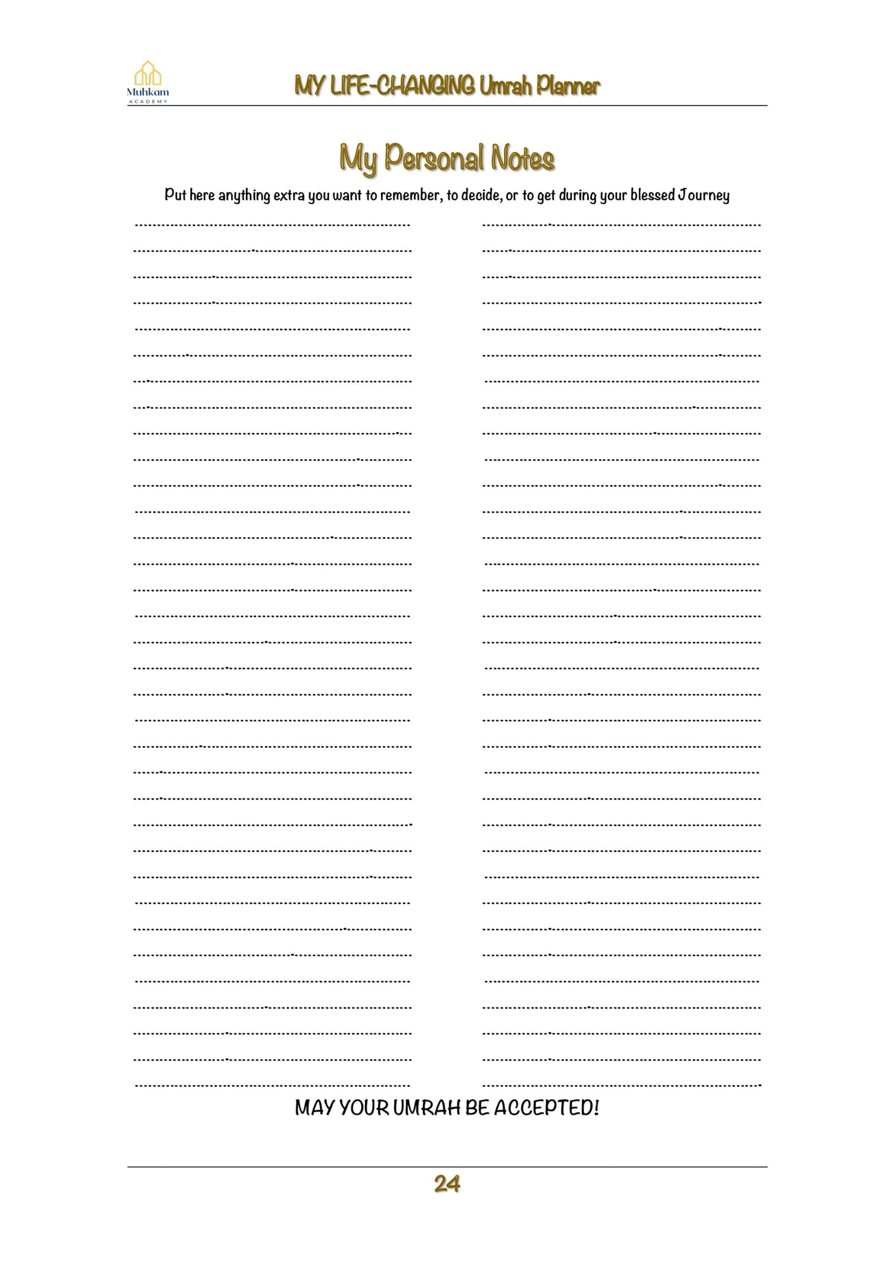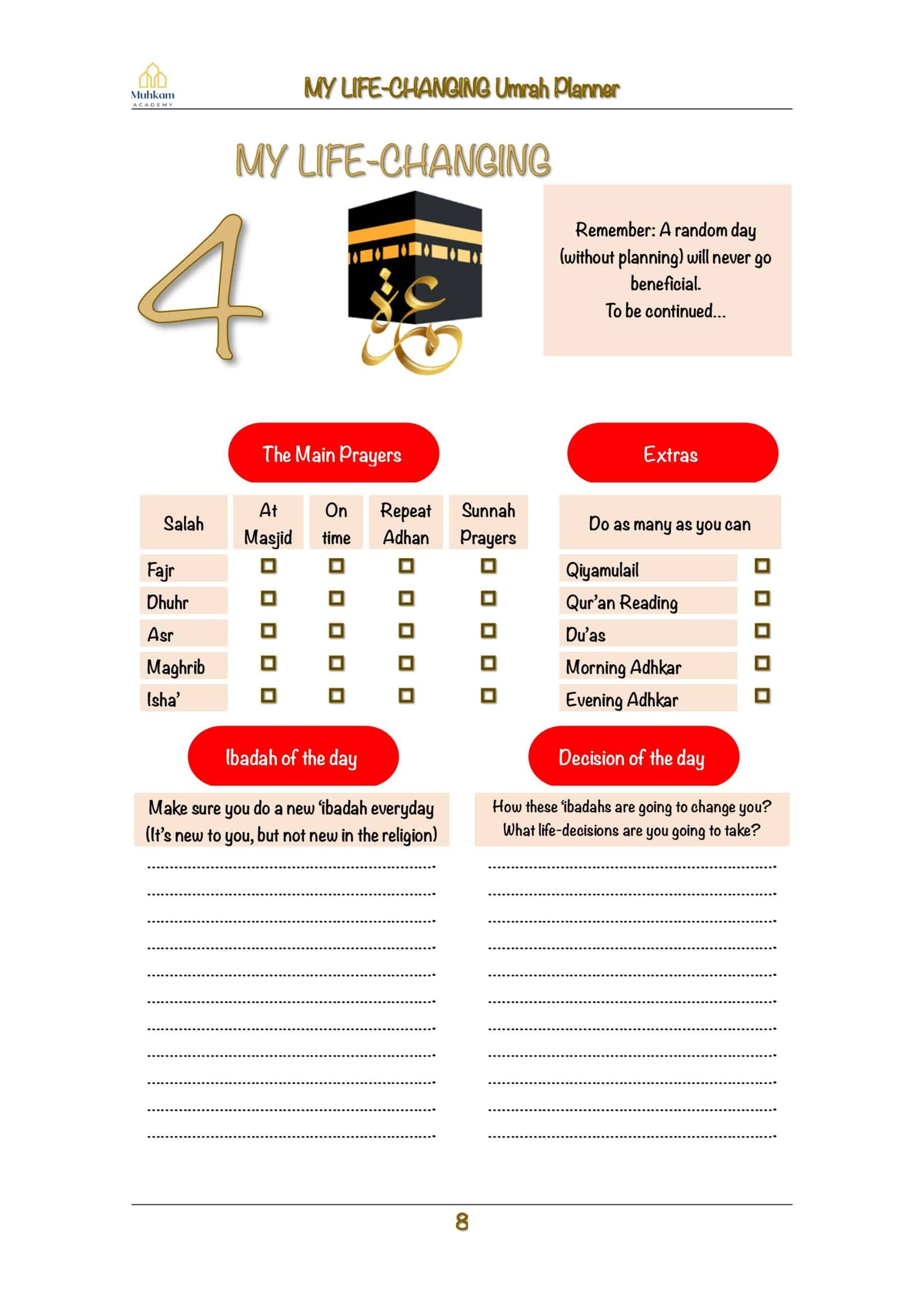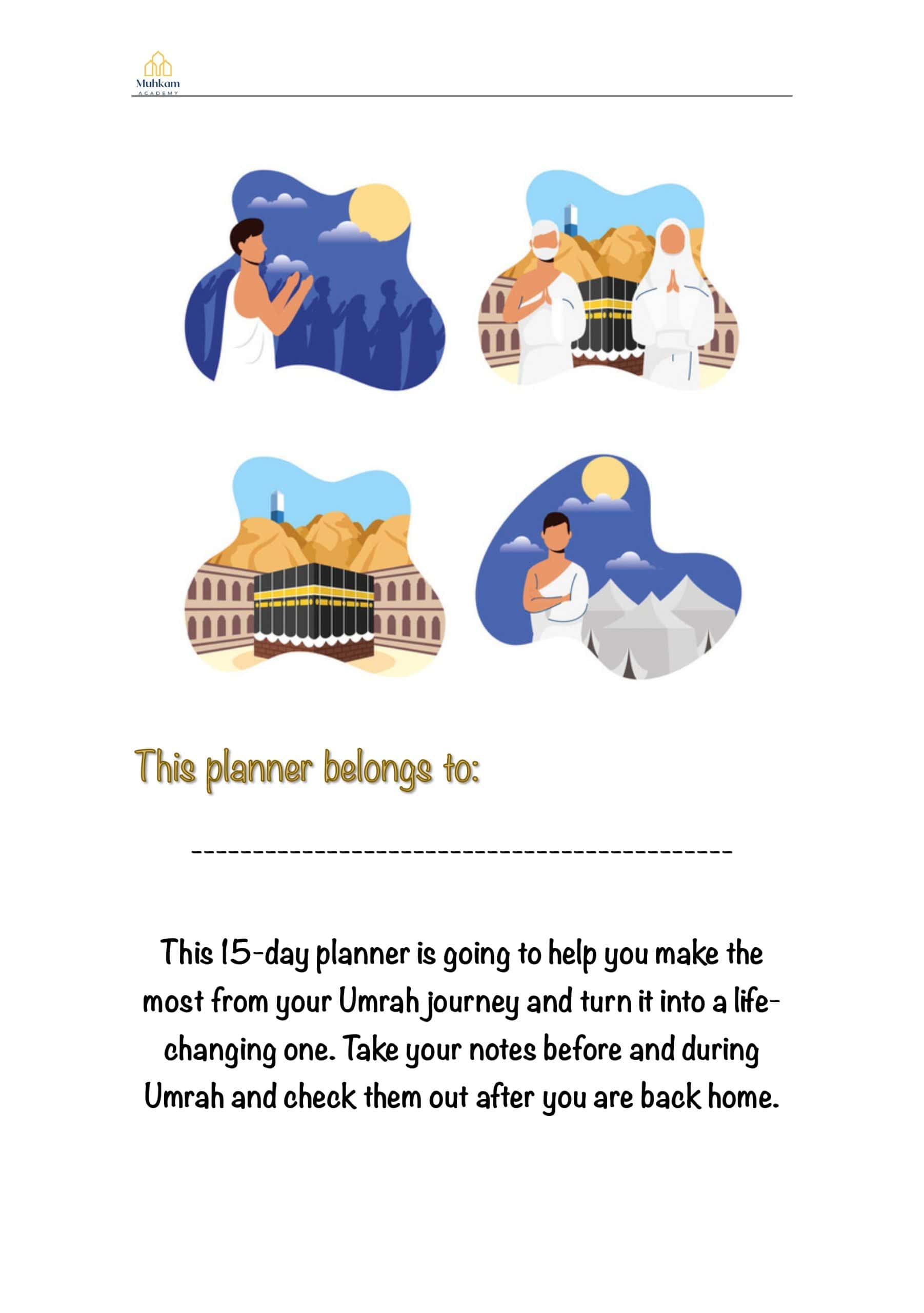 This 15-day planner is going to help you make the most from your Umrah journey and turn it into a life-changing one. Take your notes before and during Umrah and check them out after you are back home.